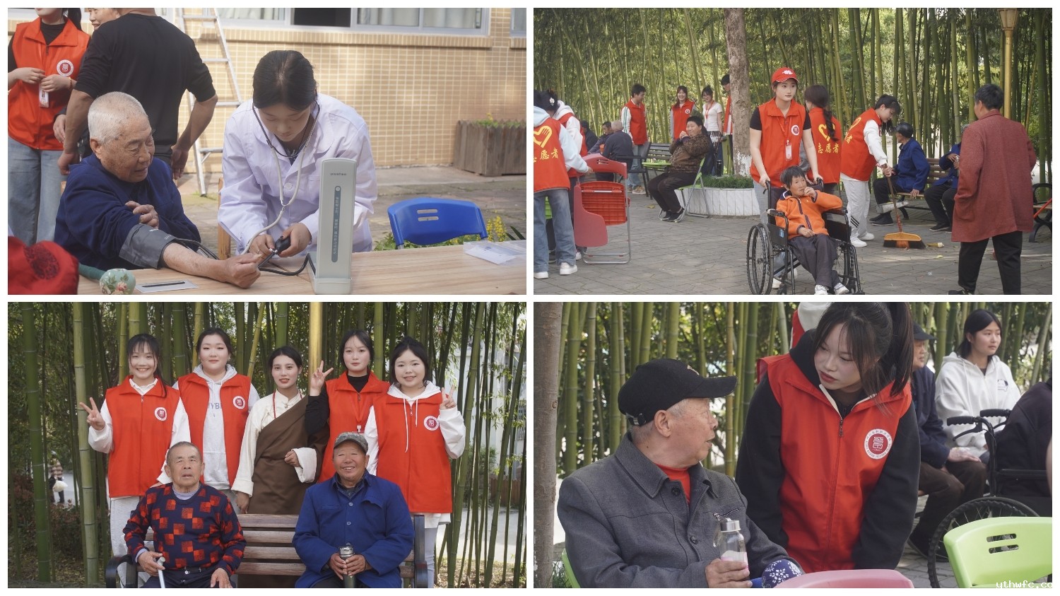 活动当天下午,护理二院的师生们满怀敬意与热忱抵达大英县福利中心,将精心制作的手工作品送给了老人们,并准备了丰富多彩的节目,涵盖活力四射的歌舞、饱含深情的合唱以及悠扬的笛子独奏。护理专业老师结合专业知识,为老人们讲解高血压、糖尿病、骨质疏松等常见疾病的预防和护理知识。       表演结束后,护理专业的同学们为老人们测量了血压,还有不少学生围坐在老人身边,认真倾听他们讲述往昔岁月里的难忘故事,现场气氛温馨而融洽。其余同学也积极参与其中,帮助福利院进行卫生清洁工作。